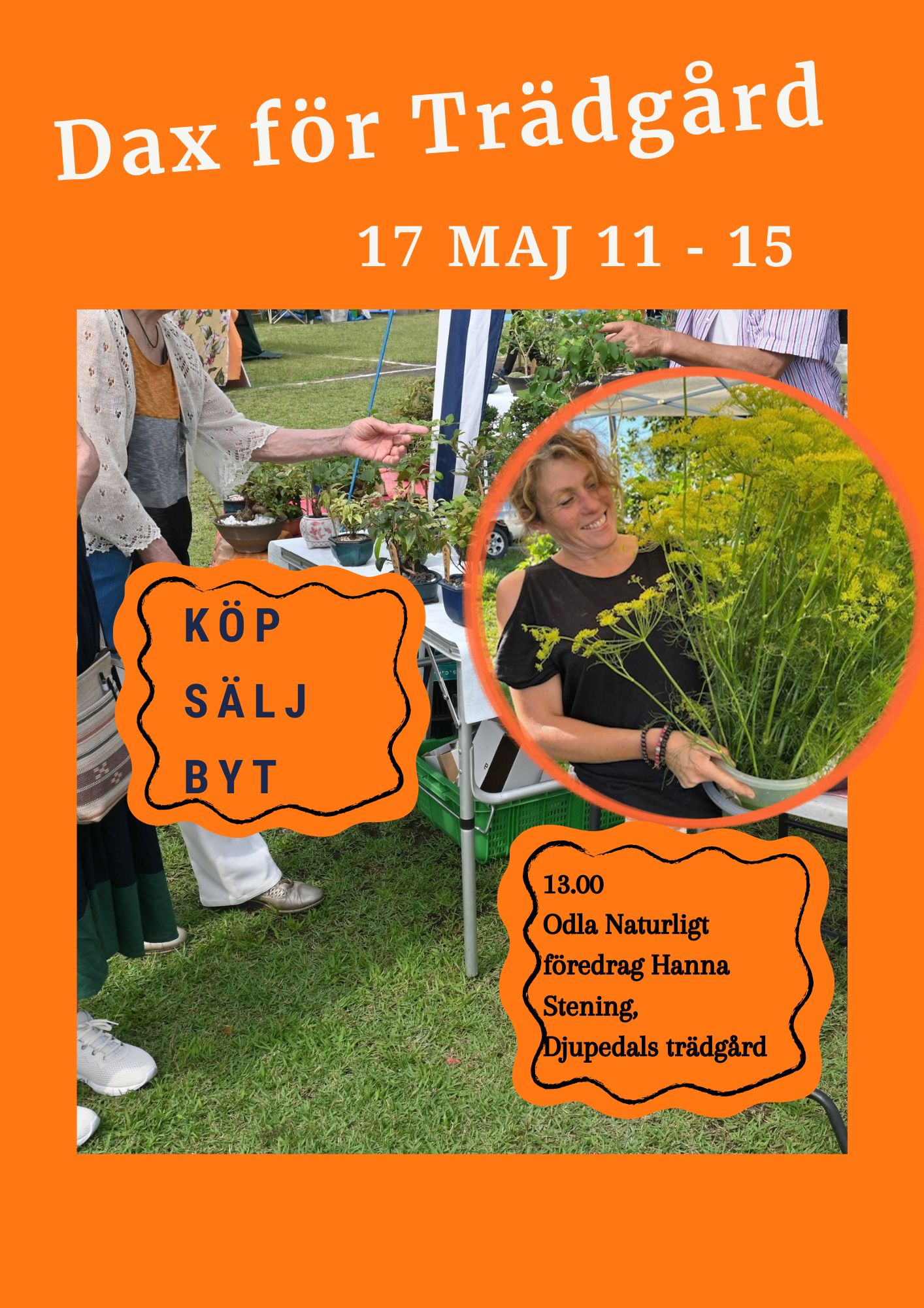 13.00 ”Odla naturligt” föredrag med Hanna Stening, Djupedals Trädgård. Hanna är en inspiratör och entusiast som har trädgård både för eget bruk och för försäljning.